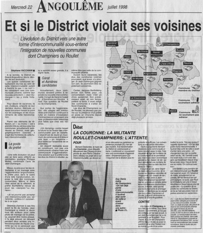 La CdC vue par la presse : 22 juillet 1998 (District - intégration Champniers) La CdC vue par la presse : 22 juillet 1998 (District - intégration Champniers) |